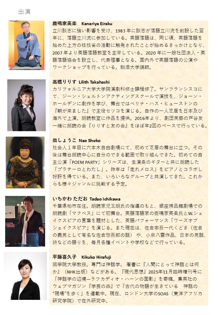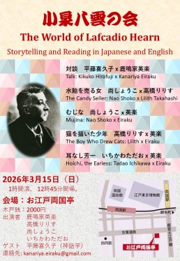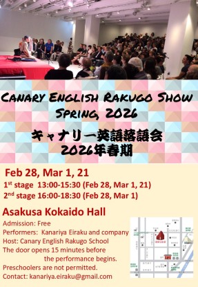 ※英語落語教室の新学期が10月から始まりました。 落語教室の新学期が来年1月から始まります。どちらも入会受付中! オンライン・クラスもあるので、全国どこからでも受けられます。お気軽にお問い合わせください。 2026年2月28日、3月1日、3月21日に、浅草公会堂でキャナリー英語落語会を開催します。 2026年3月15日、1時からお江戸両国亭で「小泉八雲の会」(日英バイリンガル)を開催します。 ※英語落語の公演、セミナーのご依頼を承ります。